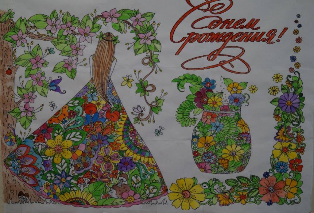Делала Насте на д.р. плакат (соединила в редакторе 3 раскраски-антистресс, распечатала на 9 листах А4). Раскрашивала 3 дня (точнее, вечера).