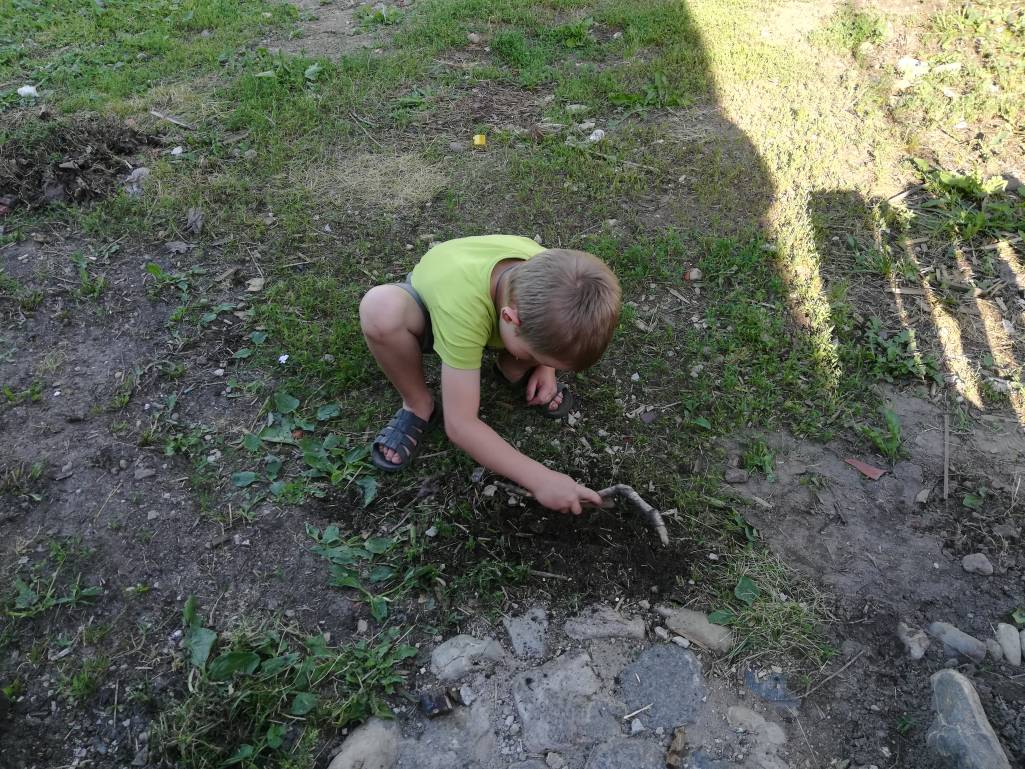 Вова сегодня "изобрёл" новый сельскохозяйственный инструмент, назвал его рыхлитель. И активно использует его по назначению.