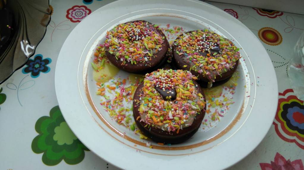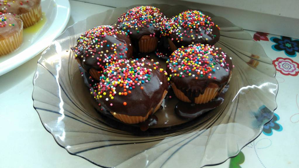 У нас ежегодный бездуховочный ритуал - покупные кексы залили покупной глазурью и засы́пали хорошенько. Даже чокопайки попали под руку.