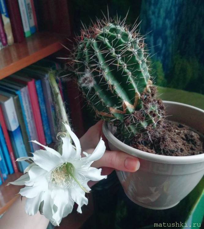 Пока мы были в отпуске, у нас зацвёл кактус, причём цветок вырос на какой-то отдельной стрелке-ветке, так интересно.