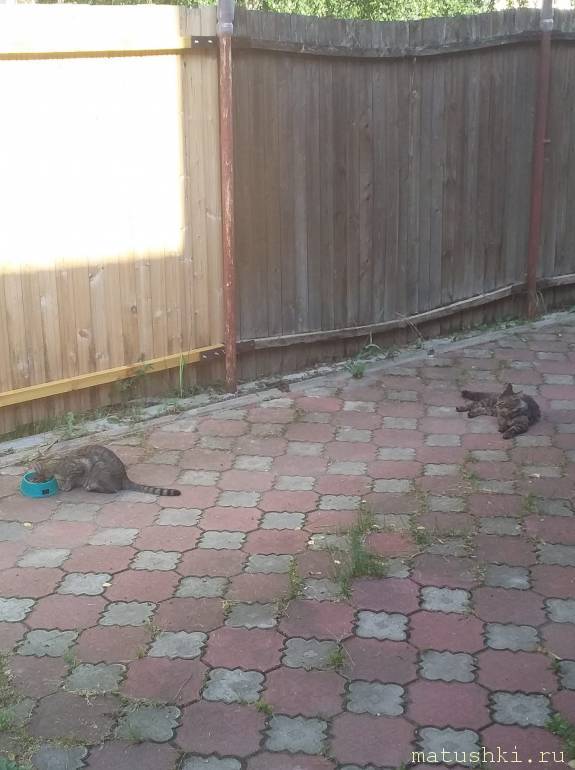 Невестка наша окотилась у моих соседей в парнике. Мурз навещает семью. Сколько котят - не знаю. Сегодня он привел ее к нам поесть. Вот, любуйтесь. Семейная идиллия. Тощая, как вешалка.