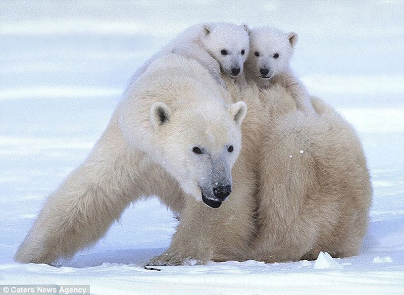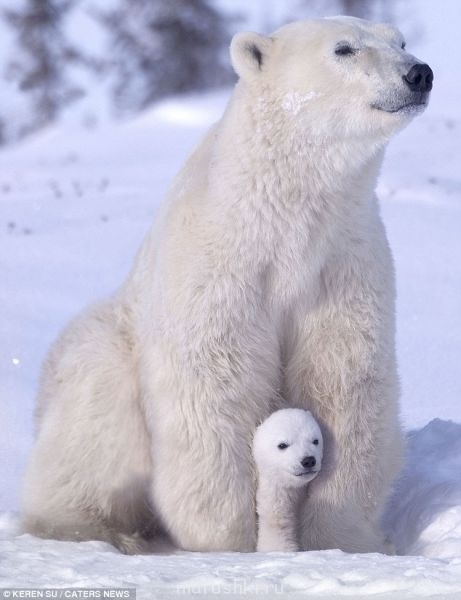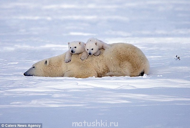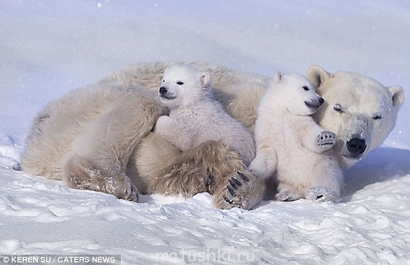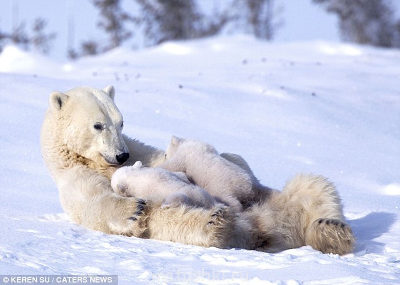 После изнурительной игры медвежатам нужно отдохнуть, и мама тут как тут – служит теплым «ковриком» на холодном снегу. Мать кормит детенышей. После этого она облизывает их, особенно животики, чтобы молоко хорошо усвоилось и переварилось.