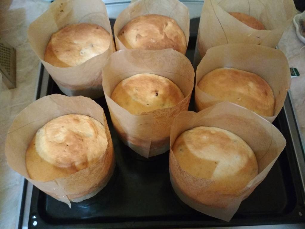 В подошедшее тесто всыпала изюм с цукатами, снова вымешала и разложила по формам. Руки при этом смазывала раст.маслом, раскладывала достаточно жидкое тесто- чуть гуще, чем на оладьи. Когда поднялись практически до верха- выпекала при 180г 45 мин. Формы- по 300-350г весом. Сверху обязательно накрыть пергаментной бумагой, т.к. творог быстро подгорает.