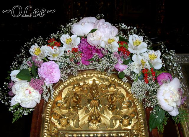 Кстати, вчера нужно было опять украшать, я перебрала цветы от этих композиций (делала их к 21-му мая), и кое-что опять пошло в дело. Зелень (кроме аспарагуса, он осыпался) вся живая, из цветов остались кустовые хризантемы. А несколько веточек рускуса живы еще с Пасхи! Вот какая живучесть! А из цветов в этот раз решили обойтись своими пионами, правда, не знаю, сколько они выдержат в оазисе. Не сфотографировала, если еще застану композицию "живой", попробую.