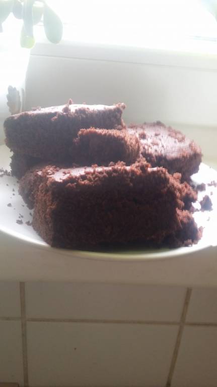 300-400 г муки. Все смешать миксером. Выпекать при 190°С около 30 мин. Я добавила кусочки черного шоколада. Вкуснее настоящего!