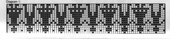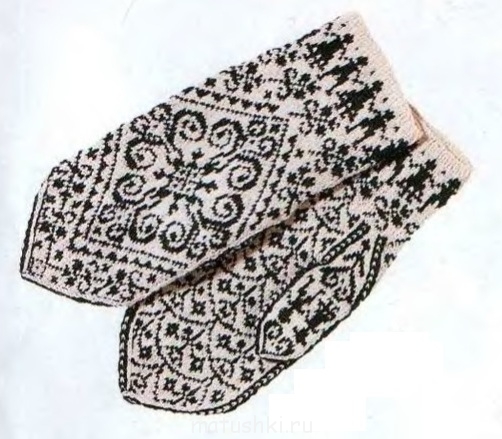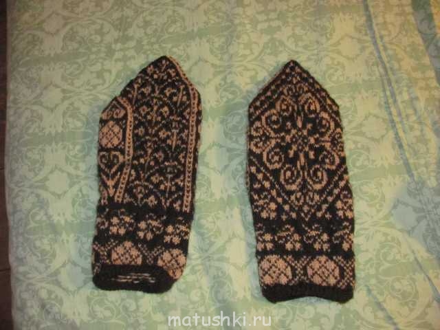 Вот, выкладываю. Там нюанс есть. У изначального рисунка первая манжета состоит из фигур человечков, а батюшка этот не любит изображений людей на одежде, и потому я нашла рисунок нейтральный, подходящий по количеству петель, и его использовала. По-моему, он вполне гармонично вписался в общий "ландшафт". Но с человечками тоже здоровско.Полтавчанка: особенно за рисунок на первых варежках