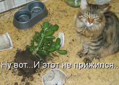 Картинка прям про мою кошку, но она только не роняет горшки, а обгрызывает растения. Благо фиалки не жует