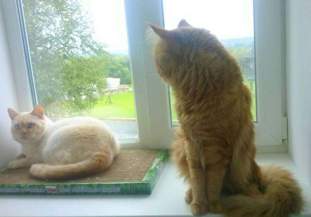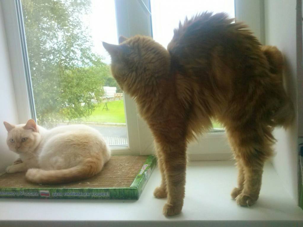 Карамель, смешное фото получилось, это Берендей потянулся спросонья, а получился эффект, как будто на Котофея спину выгнул, чего он в принципе никогда не делает, лапой махнуть может, а выгибать спину или кричать- никогда