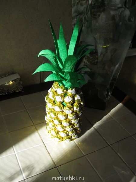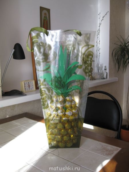 Ананасик:) Делала первый раз для мамы, ей понадобился "оригинальный "подарок для знакомых. С формой не очень.т.к. внутри бутылка "Абсолюта".