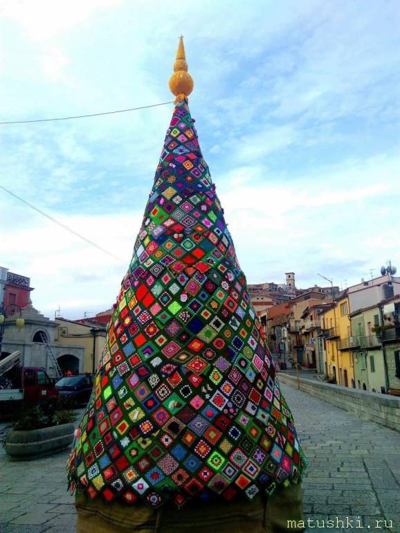 А это елочка, которую установили в Италии, сделана целиком из связанных крючком квадратных лоскутков.