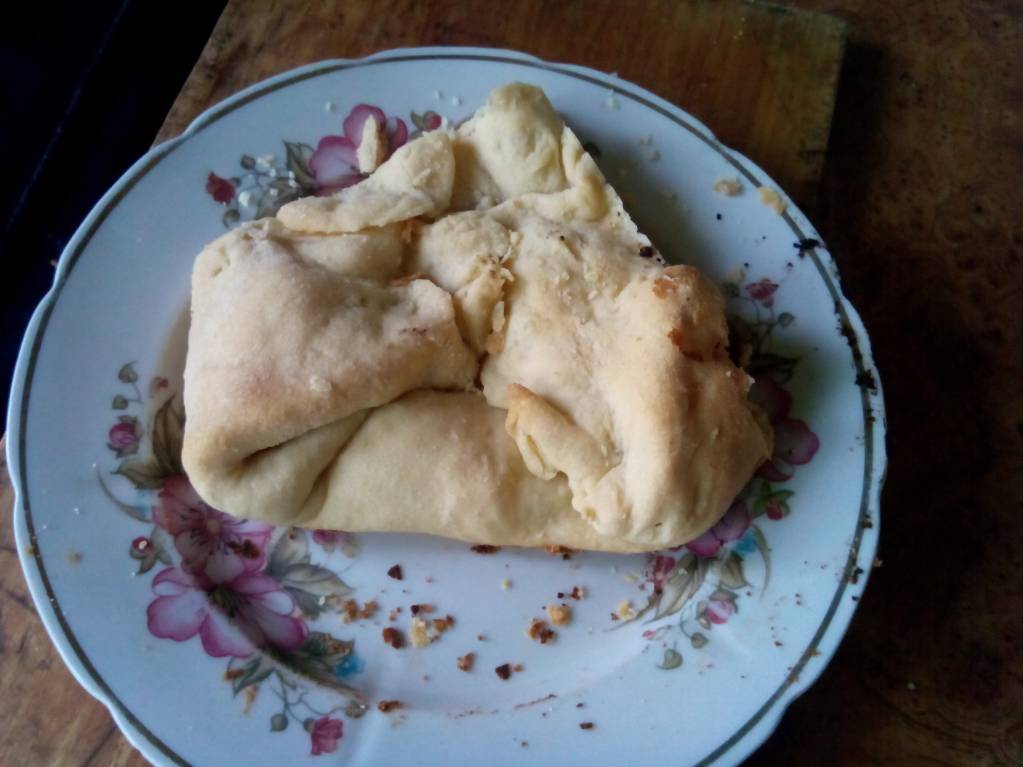 Замесить тесто, выложить начинку и в духовку. Тесто очень нежное и пирог очень вкусный. Пирог получается маленьким, если надо испечь пирог на большое количество людей, надо все все ингредиенты умножить в два раза. Я с мамой просто делаем два - три отдельных пирожка. Они получаются похожими на лепешки.
