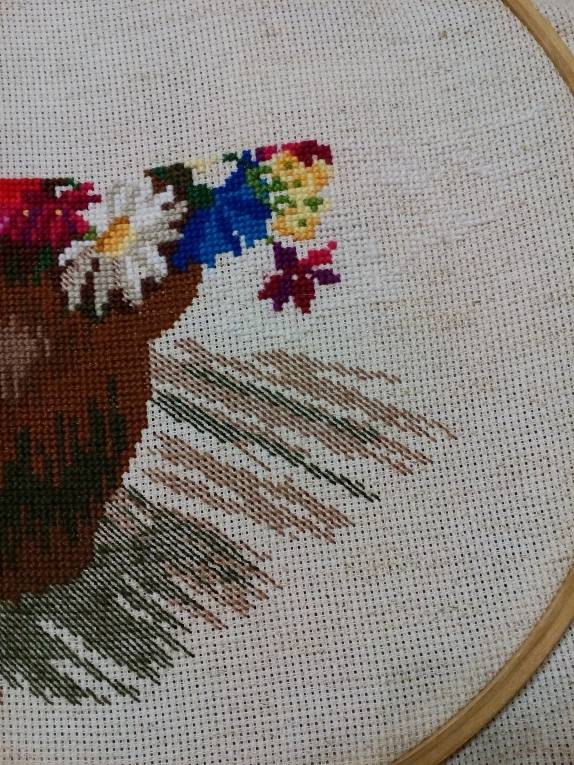 Было: Стало: В правом краю рядом с желтым и бардовым цветочками - белые крестики из одной нити. На фото их не видно, но они там есть;))