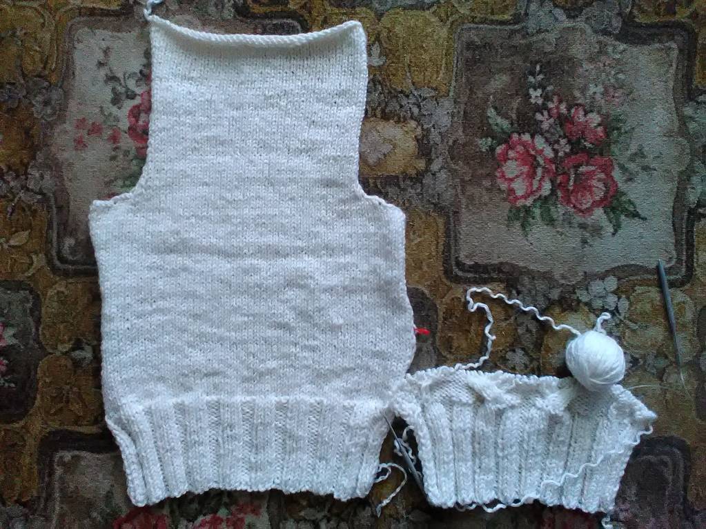 Спинка готова полностью, начала перед. Всего связано за 1-й этап 5 473 петли.