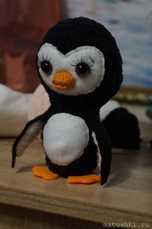 Использованы: белая и черная плюшевая пряжа, черный и оранжевый фетр, оранжевые мериносовые нитки для клюва, белый трикотаж, готовые глазики-пуговки, накладные ресницы, бутылочка от галстены в туловище (помимо наполнителя) для лучшей устойчивости.