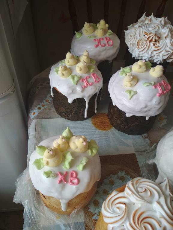 Такие куличи у нас. Мама пекла, дети украшали. Почти все розовые раздарили. Уже с ночной службы принесли. В этом году у нас осталось больше куличей, полную норму делала.