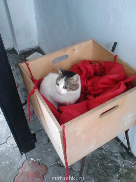 у них там под аркой от дождя несколько таких коробок стоит. мявчики прячуцца от дождя, а тут приехали дикие дети, обступили котейку и начали фоткать. поэтому взгляд у животного такой растерянный