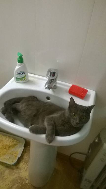 Котейка наш уже прижился, как будто всегда был. Облюбовал раковину, а что, кровать анатомической формы