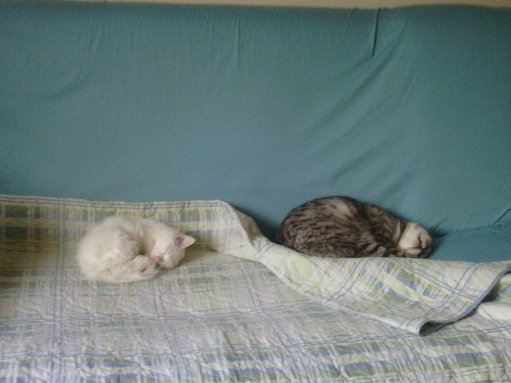 Сижу в наушниках, работаю. Но время от времени отвлекают какие-то странные звуки. Раз обернулась, другой. Потом догадалась посмотреть назад. Лежат эти две морды и сопят, Фелиса потолще посапывает, почти храпит, мелкая посвистывает потоньше