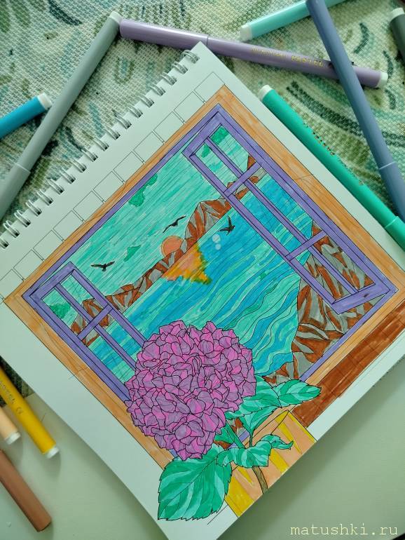Одно время часто в дороге быть приходилось, ставила себе на телефон приложения с раскрасками. Вот именно с природой, цветами, путешествия нравится.