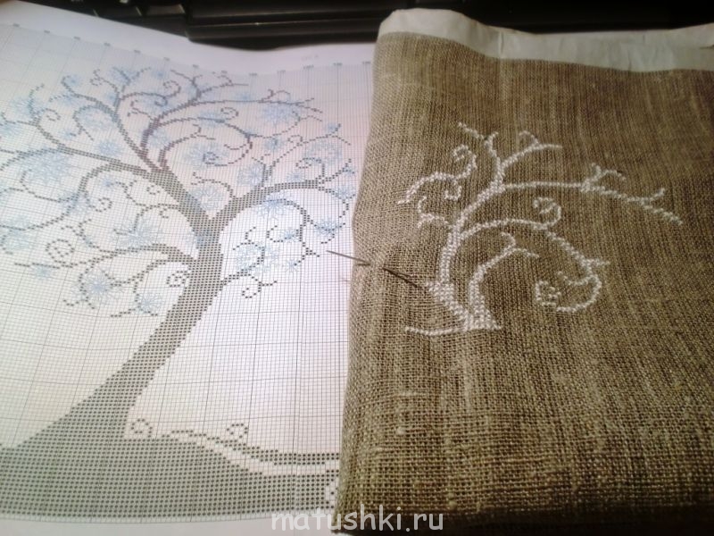 Еще я прикупила ткань-двунитку и реализовываю свое давнишнее желание повышивать на чем-то кроме канвы. Ну как "реализовываю" ... получается не очень. Ткань только на первый взгляд такая простая и ровнопереплетенная. А там все нитки разной толщины, ну и крестики, соответственно, тоже довольно разнокалиберные. В общем, вот начатая вышивка и схемка, на которой видно, что я вышиваю.