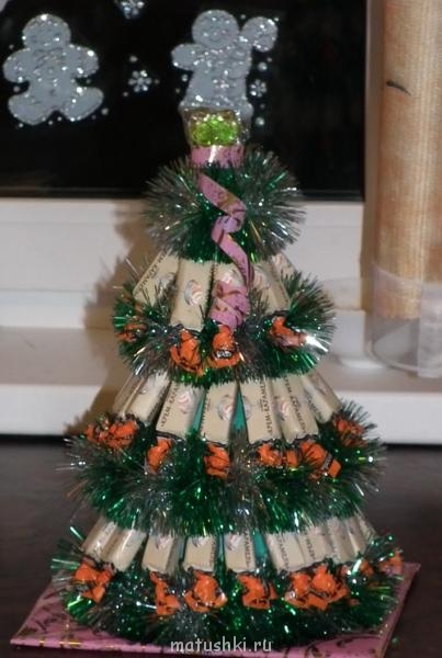 А я сделала вот такую елочку из конфет. Очень просто, интересно и красиво!!!!