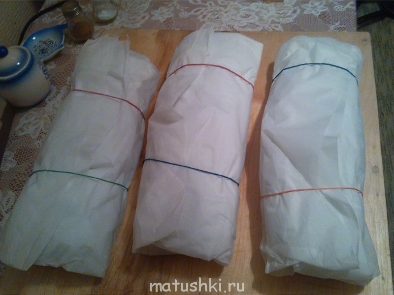 "Ребёнки" запелёнуты вместе с формочками из фольги в пекарскую бумагу и уложены в пакет и в холодильник.