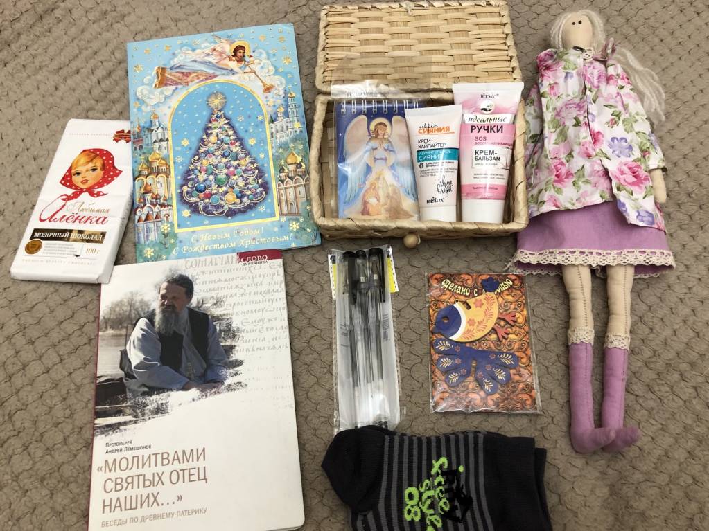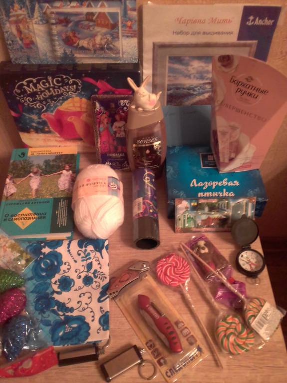 нам всё очень понравилось. Мальчишки в полном восторге от подарков, София прислала им складные ножички, вечные спички, компас, сладости. А также замечательную книгу с закладной, магнитик, подарочный набор (блокнот, ручка, закладка), очаровательный зайка, набор Бархатные ручки, гель для душа мой любимый, у меня как раз закончился, нитки для вязания, набор для вышивания, полотенце Гжель, набор ёлочных игрушек, хлопушка, конфеты Лазоревая птичка, шоколадка, коллекция чая и конечно же письмо написанное пером. Вот сколько замечательных подарков прислала нам София