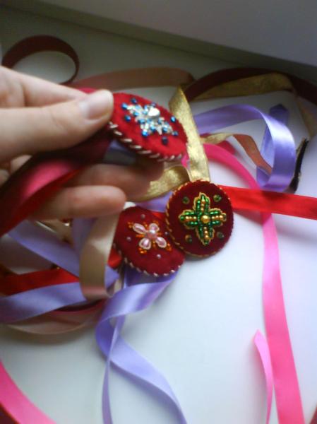 Любушка голубушка, помню как-то на Пасху делала маленькие закладочки "копеечки", так называют их потому как основа кругленькая, сверху украшаем простенький вышивкой, а снизу крепим ленточки, для закладывания между страницами.
