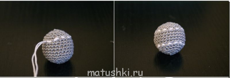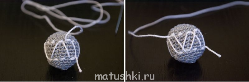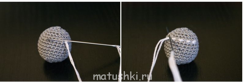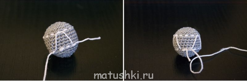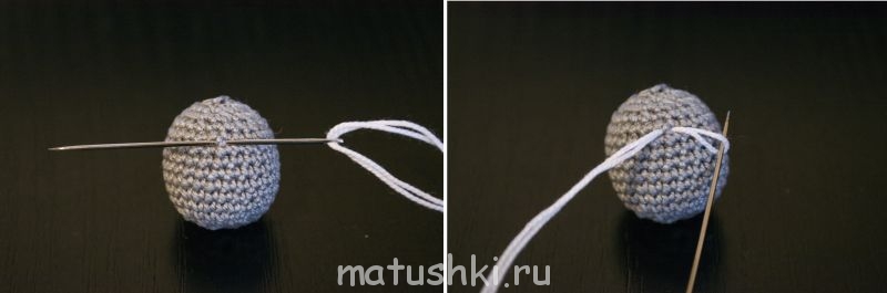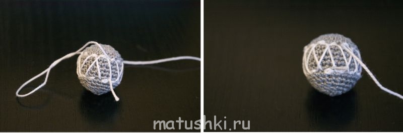 6. Продолжаем вводить иглу через два пунктира. Обходим бусину ещё два раза по кругу