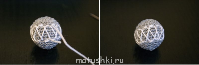 1. Складываем нить вдвое, образовывая петельку, вставляем в иглу. Это необходимо для закрепления нити в начале работы. Поддеваем иголкой ножку столбика без накида и протягиваем нить. Вводим иглу в нашу петельку. Затягиваем. 2. Поддеваем иголкой столбик через один, протягиваем, и т.д. Делаем пунктир. 3. Так, как бусины обвязываются по спирали, то необходимо "перескочить" на ряд ниже, чтобы замкнуть круг. Таким же образом проходим и нижний ряд. 4. В иглу вставляем одну нить. Начинаем среднюю часть орнамента. Вводим иглу за один из пунктиров, протягиваем. Кончик нити остается, его потом спрячем. Поддеваем пунктир в верхнем ряду. Возвращаемся в нижний ряд и вводим иглу за пунктир через два от первого. Так проходим бусину по кругу.