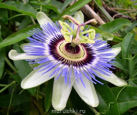 Существует легенда о том, как растение получило такое название: цветок попался на глаза монахам-иезуитам и религиозному деятелю Жакомо Босио, который посвятил растению одну из своих работ, описав его как воплощение страданий (страстей) Христа. Три рыльца пестика символизировали три гвоздя, которыми Христос был прибит к кресту, «корона» цветка – терновый венец, тычинки – пять ран, лист – наконечник копья, которым Христос был пронзен, стебель растения – веревки, а усики – бичи, которыми истязали Христа. И даже маленькие железки на обратной стороне листа нашли свое объяснение – это 30 серебренников, полученных Иудой за предательство. Итак – Пассиос – страдание и Флос – цветок: и в итоге получаем цветок страданий, страстей - пассифлору - так это название к ней на века и прилипло.