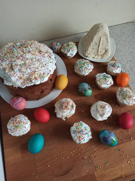девочки,я совсем немного напекла куличей,на половину порции,а мама моя поставила тесто на пирожки и как обычно "немного переборщила",барашек тоже стал нашей пасхальной традицией,ну и яйца.Вчера отправила вечером фото брату,он перезвонил и сказал что к ним заедет наш сосед(его друг),и мы половину передали в Ялту.