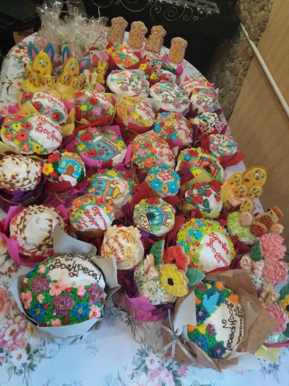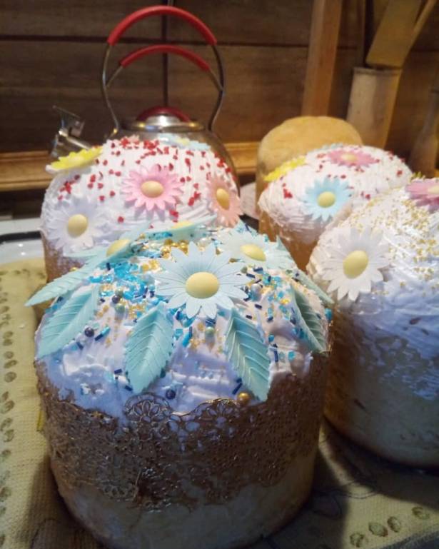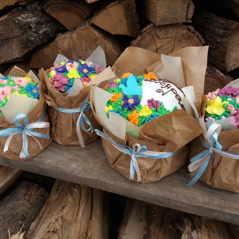 В этом году испекла около 80 куличей. Людям хотелось праздника, все куличи в росписи, с пряниками. А мне понравилось работать только с одним заказом: малюсенькие куличи по 150 гр с обычной глазурью и посыпкой. Очень устала от этих ярких красок. Не куличи, а торты какие то