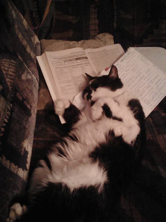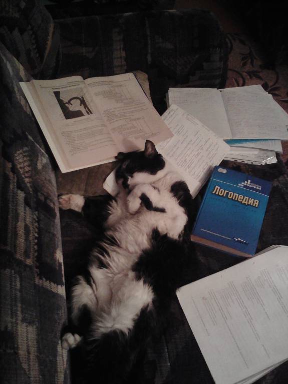 Мамин кот Масик мне очень помогает учить материал к выпускном экзамену.