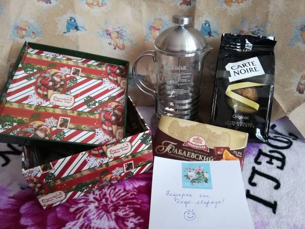 Добрянка . Соня и Света. Набираю текст, а слёзы сами льются. Два ангелочка не дают мне унывать, и обрадовали меня посылочкой, хоть и не имею участия в акции. Восполнили мне потерю френч-пресса, да ещё и объём гораздо больше сломавшегося! Теперь я точно не буду вылезать из-за чашки кофе. Кстати, девочки позаботились и об этом. В коробочке с развесёлым Дедом Морозом (Санта Клаус, в этом случае, не к слову) я обнаружила одну из тех марок кофе, которые я предпочитаю!