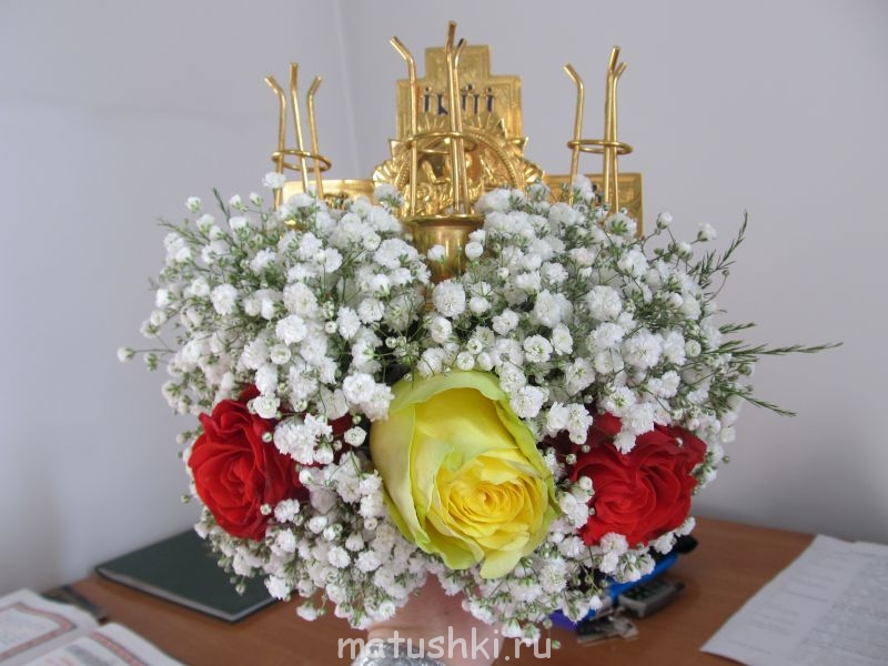 А дело вот в чем. Мне завтра, скорее всего одной ( и вообще в первый раз) придется украшать крест. В наличии у меня - крест на бархатной основе бордового цвета, 3 кустовых хризантемы белого цвета и 3 кустовых хризантемы розового цвета. Ах, да, еще гипсофила - 2 шт. и один кирпич основы. И времени скорее всего очень мало будет. Вот сижу и думаю, как мне на этот бархат прикреплять основу с цветами, так чтобы ничего не падало, когда батюшка будет крест брать в руки и поднимать. Чем крепить, как крепить....(смайлик бьющейся головы о стенку).
