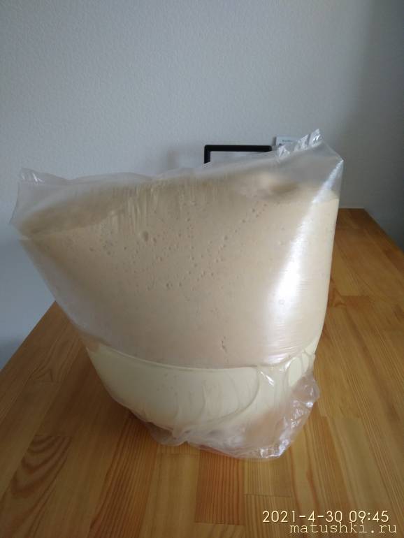 Ездила я сегодня с тестом. На улице примерно +5. Постоять на остановке пришлось - утром транспорт ещё плохо ходит. Тесто в пластиковых вёдрах (от майонеза) верх замотан пищевой плёнкой.