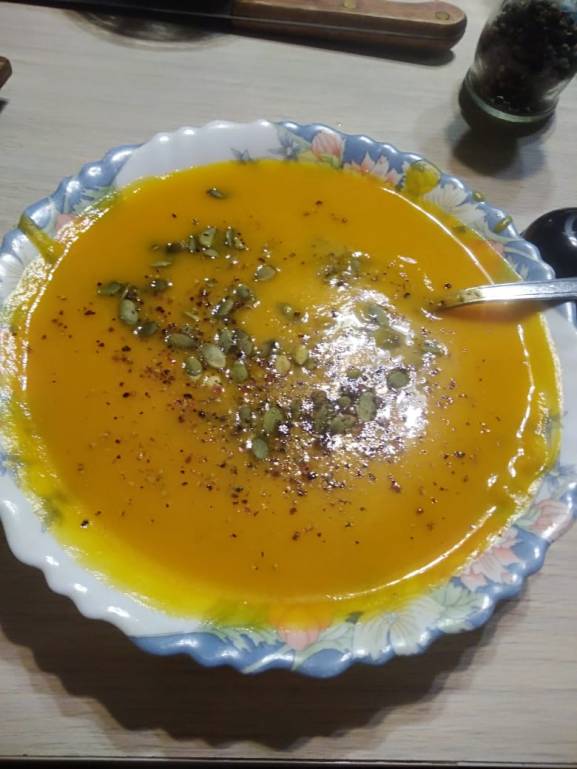 Сегодня у нас такой тыквенный суп-пюре на кокосовом молоке. Попробовала его впервые в Берлине, в веганском кафе,и стала готовить дома.