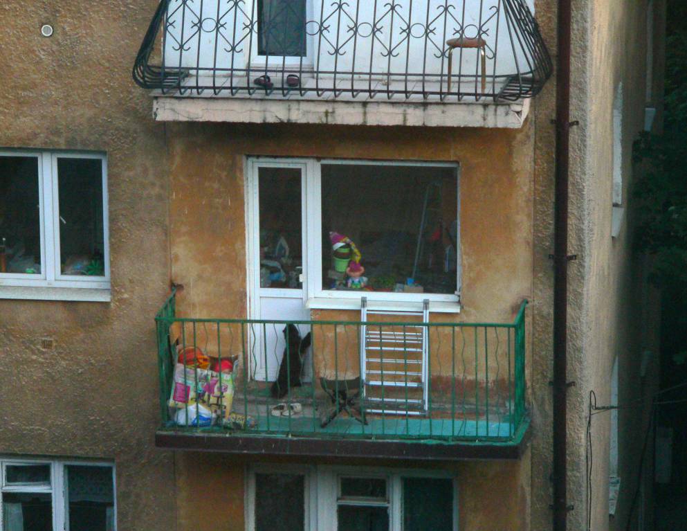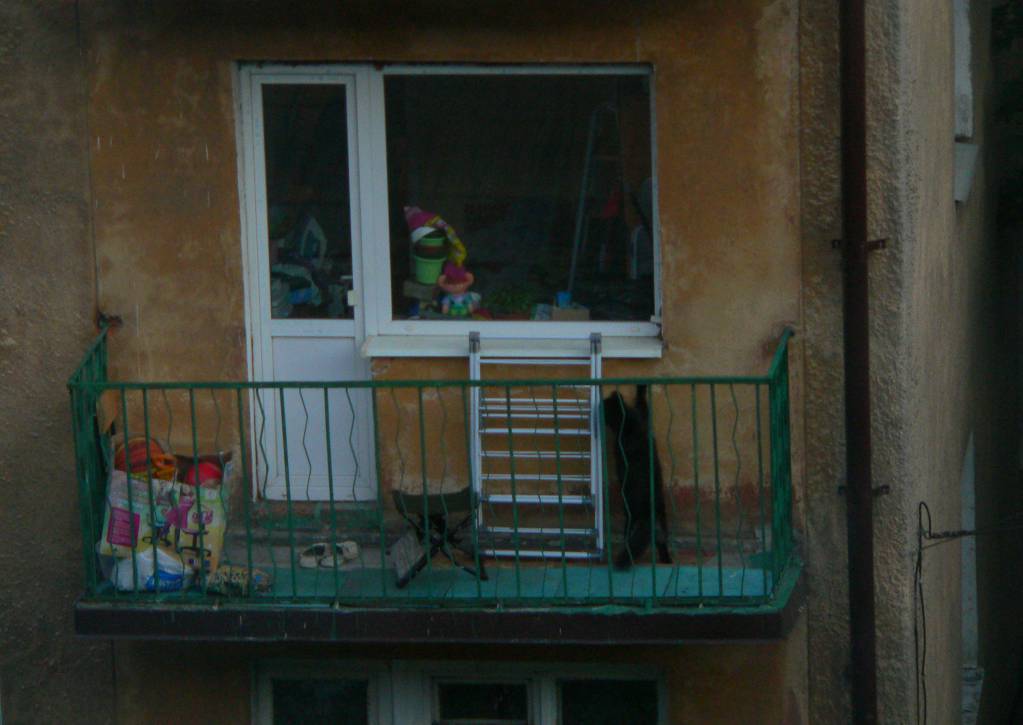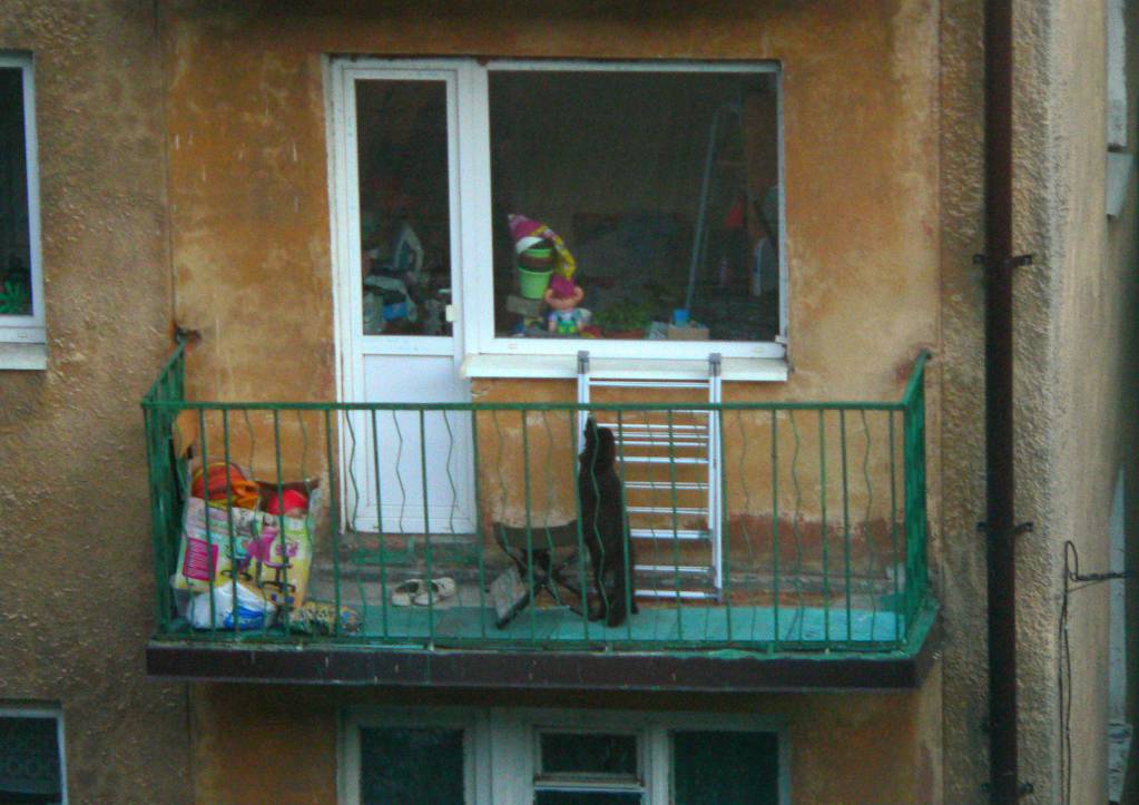 Бедняга сейчас сидит под стеночкой дома, на балконе. Но подумывал прыгнуть (третий этаж) - почти вылез, но одумался.