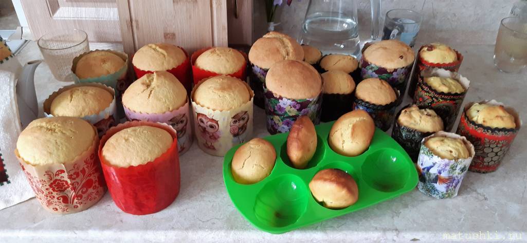 Анабель, спасибо! Получилось 6 куличей в формах диаметром 11 см, 1 (в красной форме) 14 см и 2 малыша по 7 см.