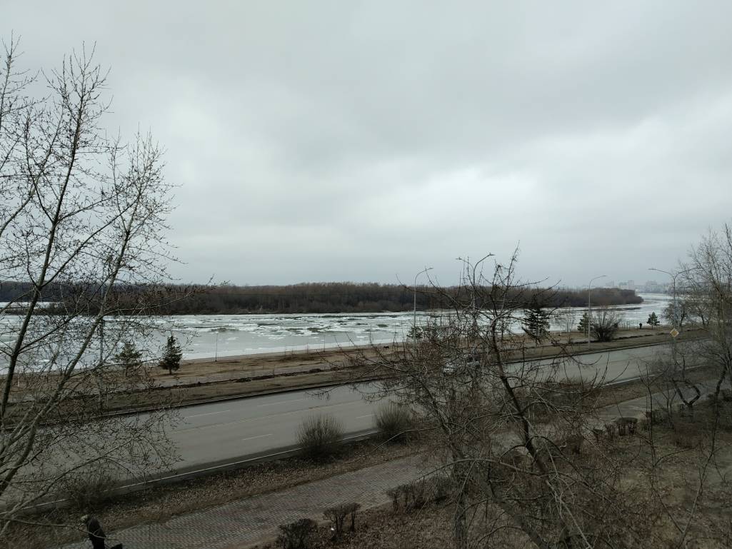 Ледоход на Иртыше полным ходом, правда пасмурно и все серое, дождик накапывает.
