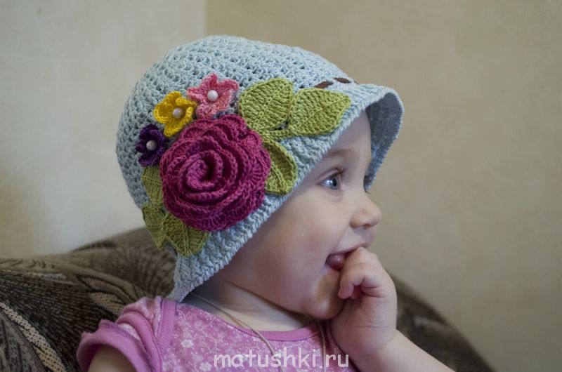 Шляпка-клумба для дочки. Нитки взяла х/б, для шляпки, розы и листиков YARN ART Begonia, для мелких цветочков Alize Miss. Крючок 2,5.