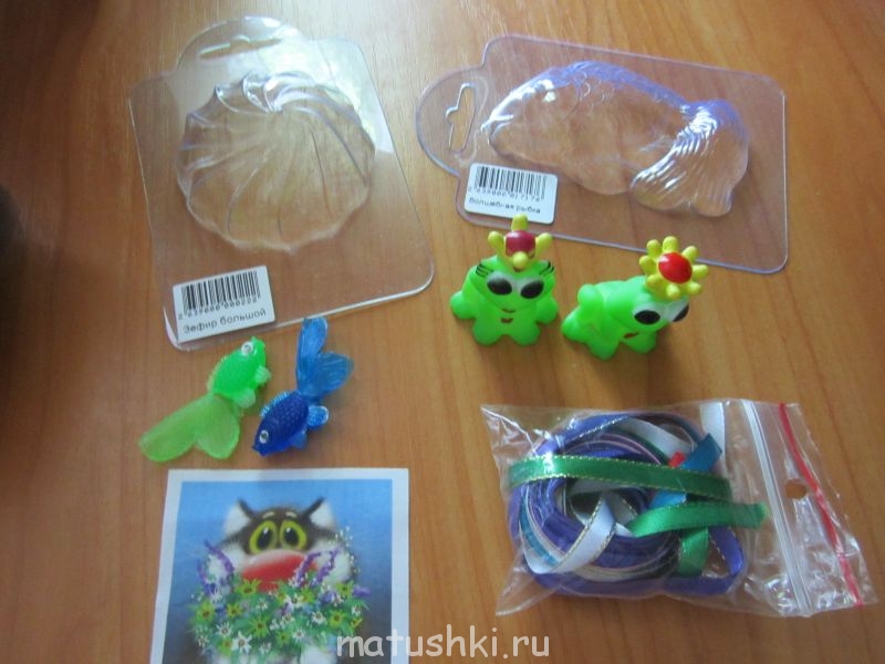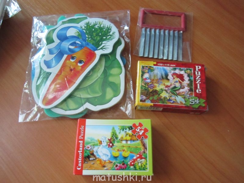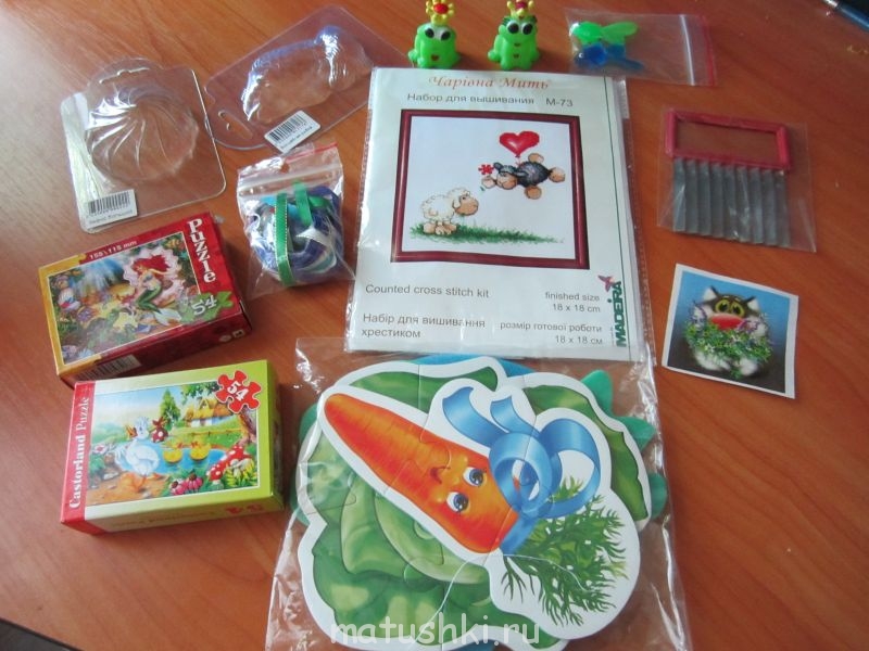 Для детей пазлы (коробки фотографировала пустыми, потому что сами пазлы были уже собраны девчатами), две формочки для мыла, водорастворимая бумага и ифигурки двух лягушек и рыбок тоже для вставки в мыло (никогда не пробовала такое мыло варить, а теперь стимул есть