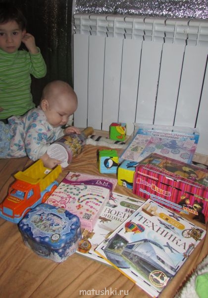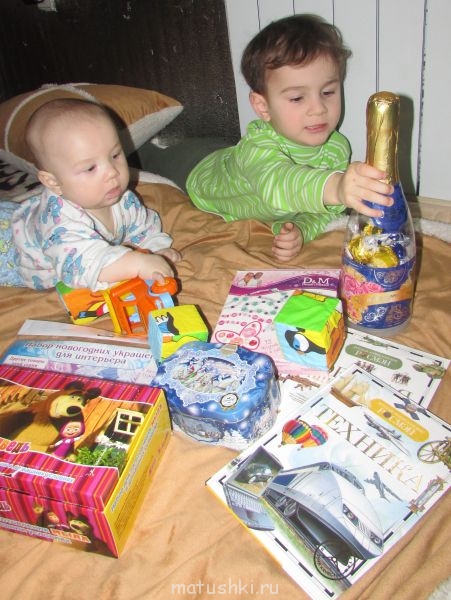 !Маська(маленький) наверное самый счастливый,старшенький серьезно рассматривает подарки,а мужья....они еще не просто немножко,они по-настоящему дети,когда дело касается подарков