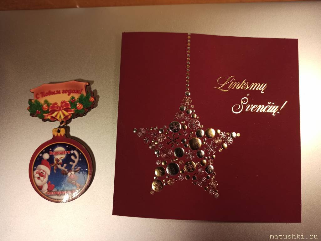 Дюймовочка, да это на литовском.Переводится как "Веселых праздников!" Есть у нас книжный магазин, где продают русские открытки, но когда я пришла уже ничего не было. Вот я и решила магнитик на русском и открытку на литовском. Рада, что тебе понравилось!