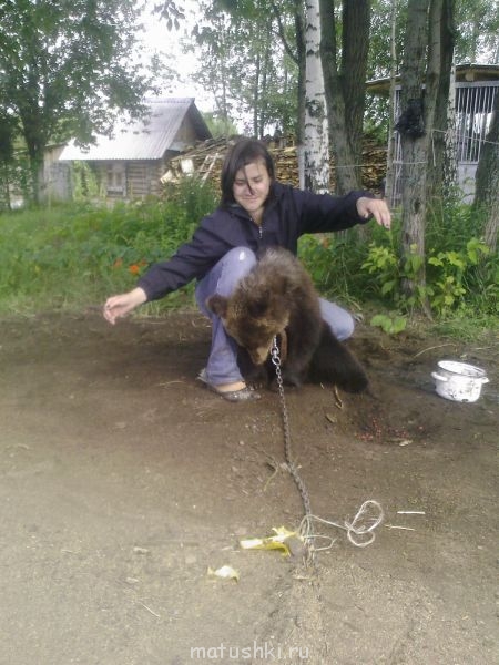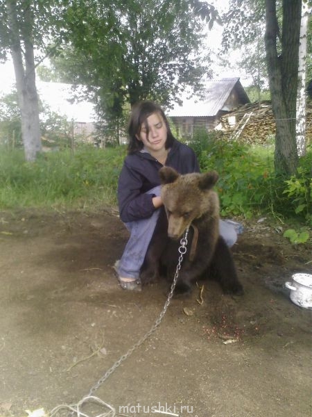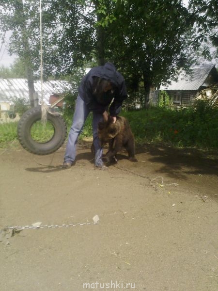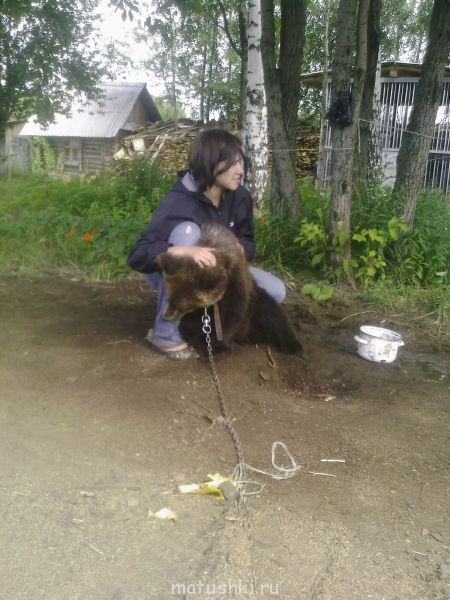 Моя Катюшка была в приюте о. Бориса и там, кроме лошадок, живут енотик и медведики. Большой медвежонок уже в клетке был, а маленький только на привязи - безобидный такой, любитель мороженного! Сейчас уже взрослый - давненько это было. Вот фотки