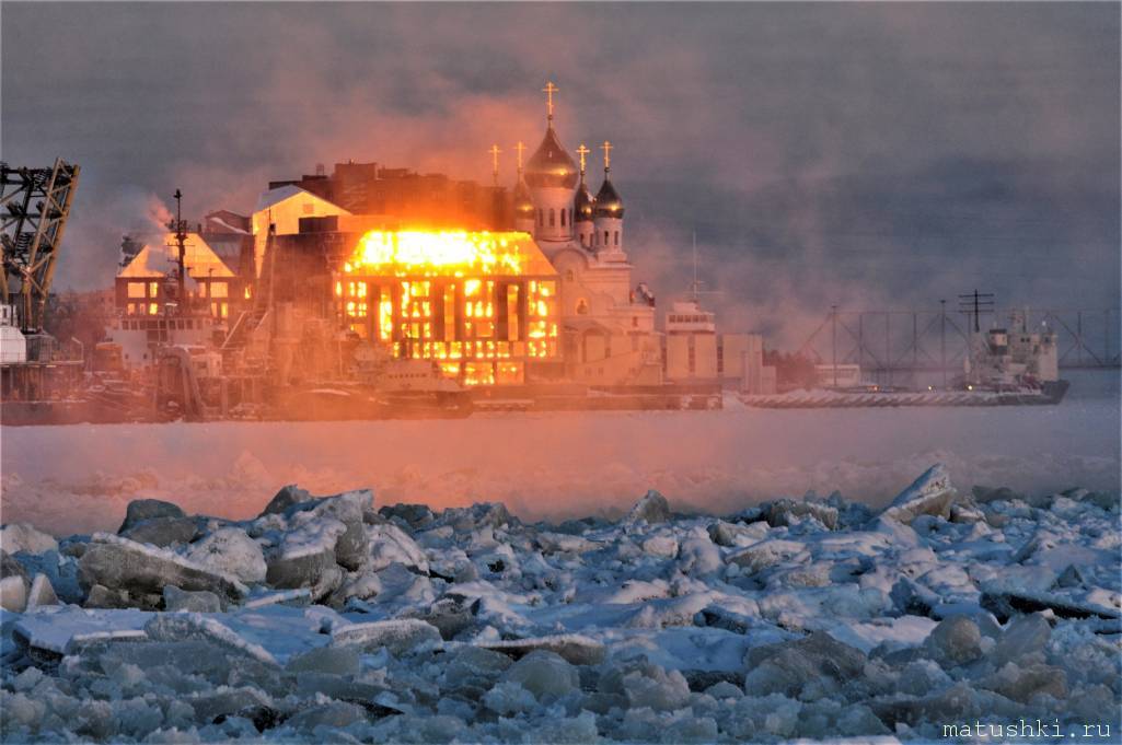 Снимок сделан в Архангельске со стороны реки, на переднем плане обломки льда возле русла