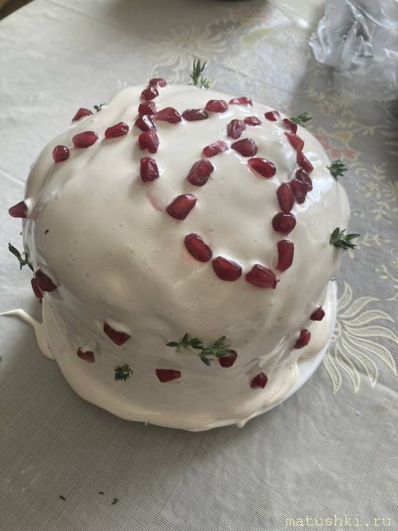 Я переоценила свои возможности (как всегда) и совсем без сил. Зря оставляю украшение на последний день. Но зато воплотила увиденную у Казанцевой задумку: покрыть полностью глазурью и украсить зёрнами граната с веточками (у меня тимьян).