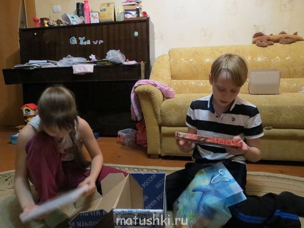 Дети ходили на почту со мной, принесли домой, сын схватил канцелярский нож и поскакал распаковывать, я в одном сапоге бегу следом и визжу: "Погоди! Я тоже хочу распаковывать!" (Хорошо нашего папы дома не было