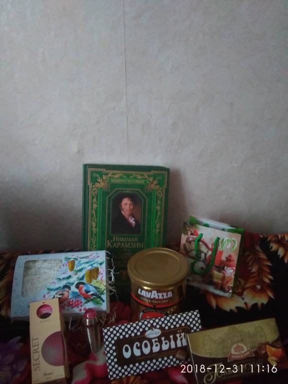 В посылке были книга Карамзина "О любви к Отечеству, История Государства Российского", масляные духи с ароматом розы, кофе Lavazza, две шоколадки "Бабаевский" (очень вкусный) и "Особый", письмо с поздравлениями.